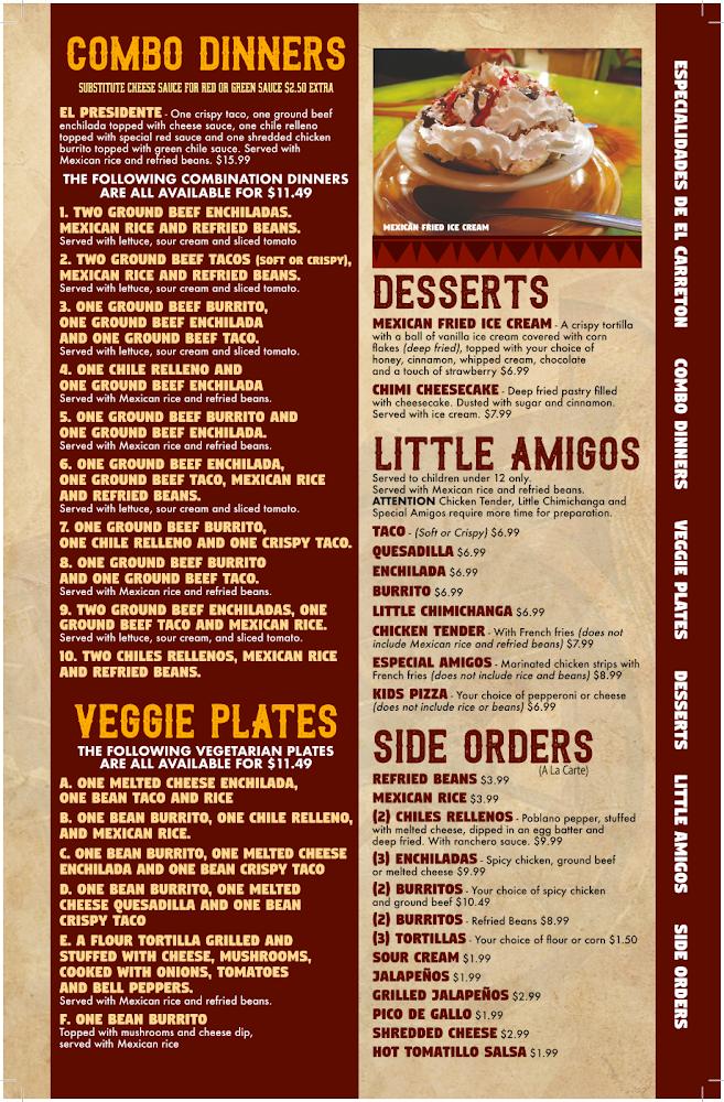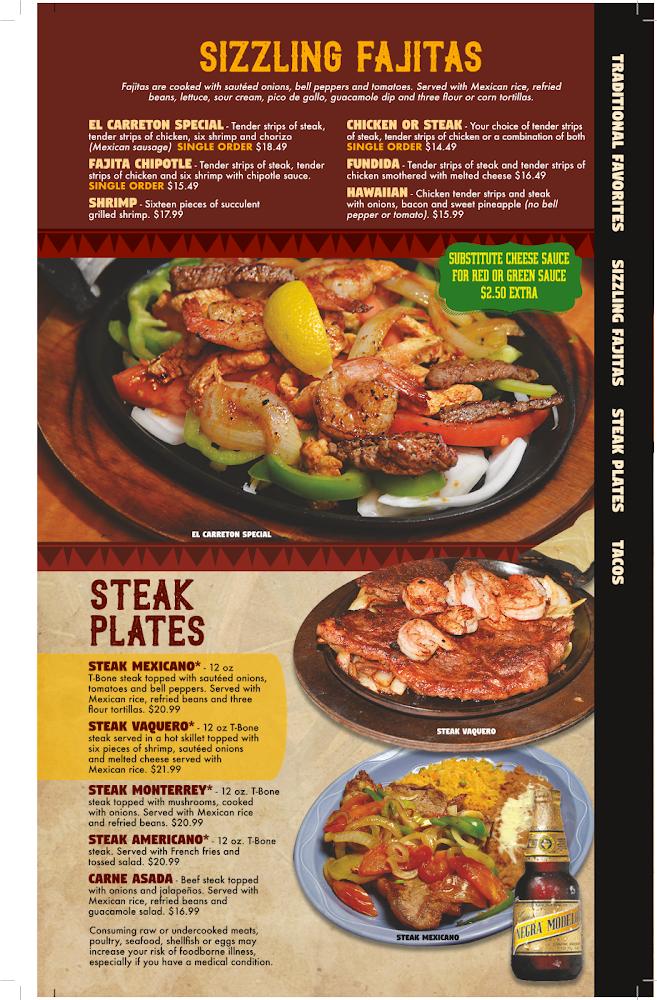 El Carreton's menu boasts a diverse selection of authentic Mexican dishes, crafted for all tastes. Guests can choose from comforting appetizers like guacamole dip and cheese dip, ideal for sharing. The taco salad options are both flavorful and satisfying, complemented by the house-made dressings. Noteworthy main courses include the El Carreton Special fajitas and the Steak Vaquero, both highly acclaimed.