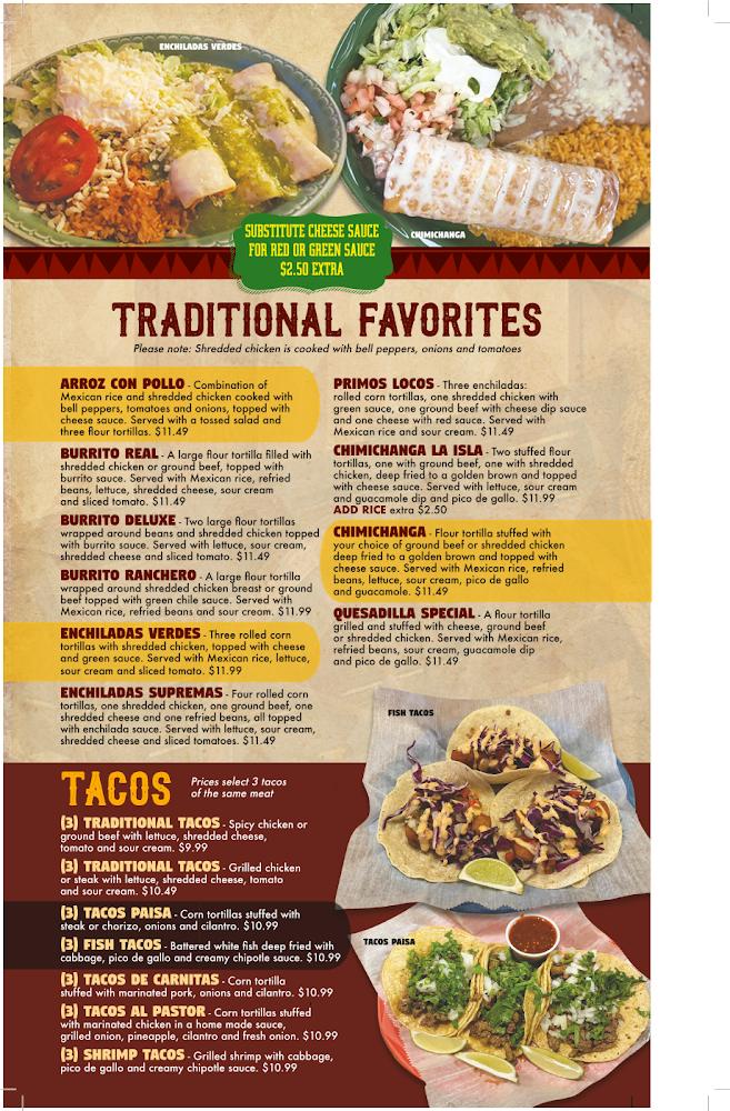 A large flour tortilla filled with shredded chicken or ground beef, topped with burrito sauce. Served with Mexican rice, refried beans, lettuce, shredded cheese, sour cream and sliced tomato.
